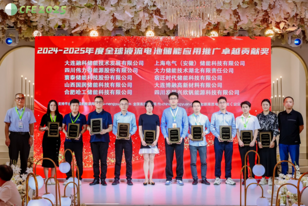 大会期间,公司凭借在技术创新与项目落地领域的卓越表现,成功荣膺 “2024-2025年度全球液流电池储能应用推广卓越贡献奖”,这一荣誉充分体现了行业对公司技术实力与市场成果的高度认可。