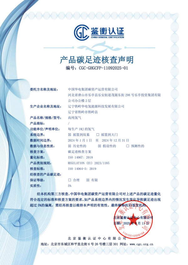 近日,在中国华电集团市场营销部指导下,华电碳资产公司牵头依托辽宁华电铁岭新台子一期25MW风电离网储能制氢一体化项目,成功完成集团首个高纯氢气产品碳足迹核算,形成专业核算报告。构建起覆盖全生命周期的绿氢产品碳足迹标识认证方案,开创性开展绿色认证实践。