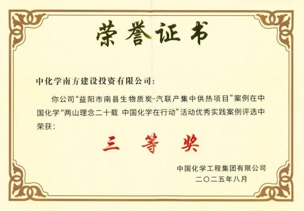 近日,由常州恒宁能源设备有限公司承建的《益阳市南县生物质炭-汽联产集中供热项目》在中国化学工程集团公司组织开展的“绿水青山就是金山银山”优秀实践案例征集活动中,荣获三等奖。